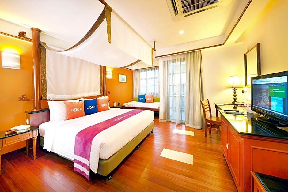 Each of the 418 square feet Deluxe Water Chalets comes with Hollywood twin beds (Hollywood twin beds feature two single beds lined up next to each other) and 1 day bed. Perched over the sea, the chalets either come with full sea views, or partial sea views along with the lovely surrounding resort compound. Surcharges may be applicable for guaranteed full sea-view rooms.
